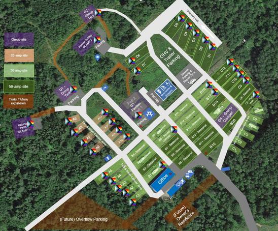 We have a variety of campsite styles and types to choose from when making your reservation. The with rainbow icons on them are the sites we have blocked for the event weekend. They include:
